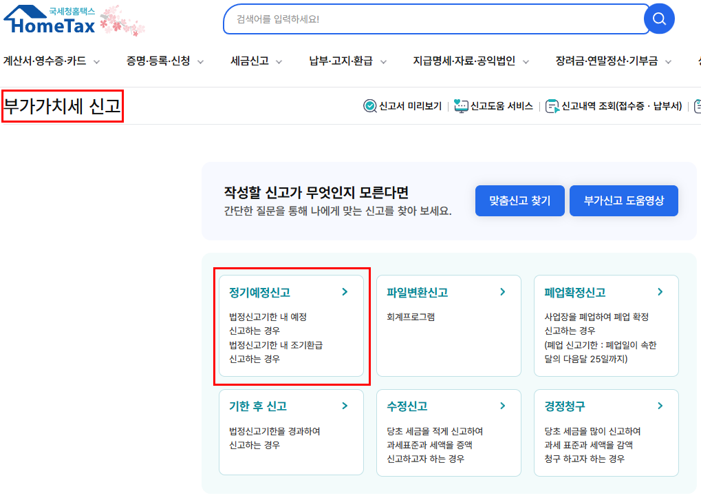 - '정기신고(확정/예정)'를 클릭하여 과세 유형을 선택합니다.