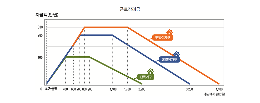 - 홑벌이 가구는 2,100만 원, 맞벌이 가구는 2,500만 원부터 지급액이 감소 시작
